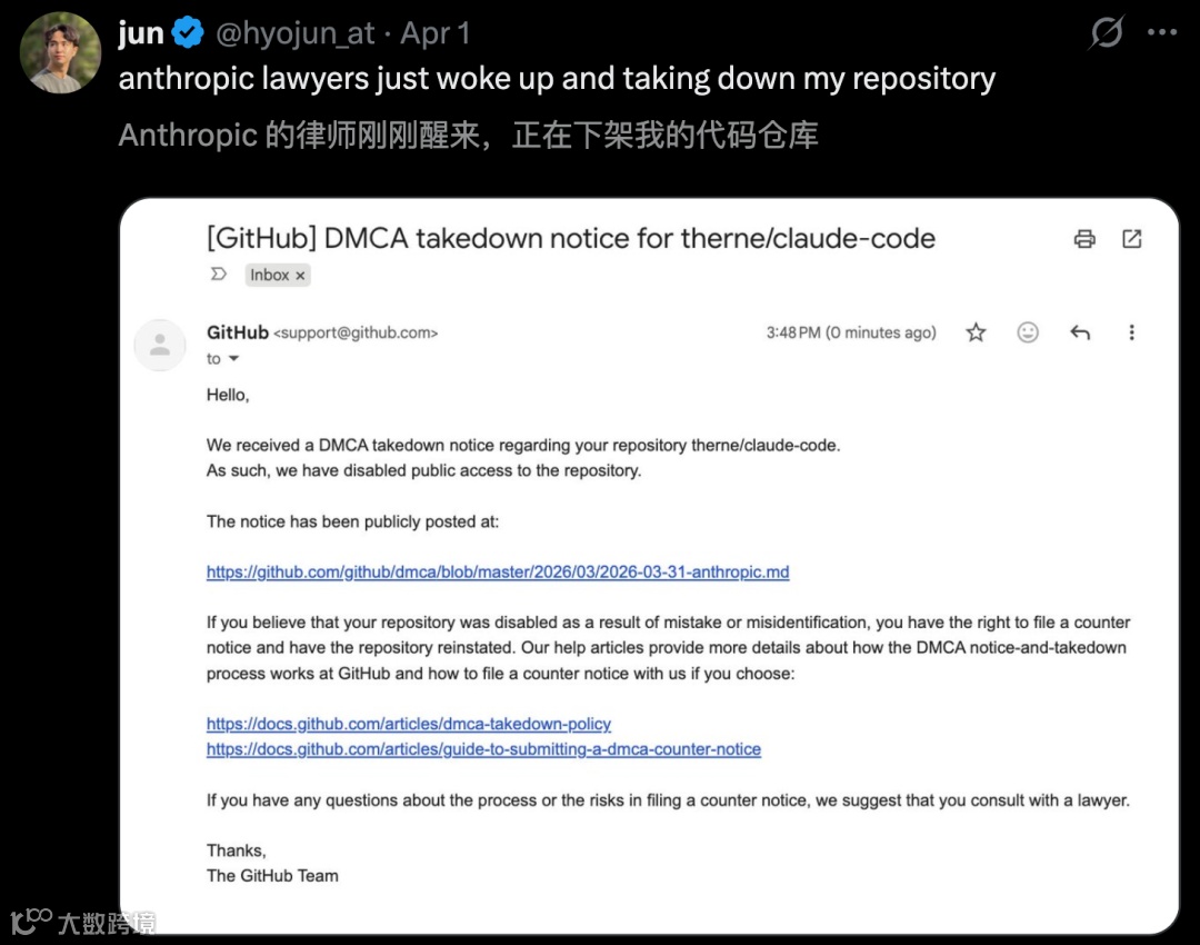 Anthropic因内部疏忽导致51万行Claude Code核心源代码在GitHub上公开传播。韩国开发者将源码上传后两小时内,Fork数迅速突破10万。Anthropic随即向GitHub发送DMCA版权删除通知,却因技术失误触发Fork网络连锁反应,8100个代码库被无差别下架。