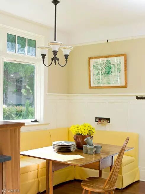 角落里的小宴会设计,明黄色的“L”型长椅,恰巧容纳在这个空间里,方形的餐桌在人员增多的情况下还可以添加几把椅子。在这里与家人一起享用早餐,有多快乐和美好。