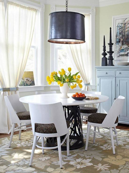 有时候一些小小的细节也能让餐厅出彩。比如深色碎花坐垫和大花图案地毯形成风格呼应,黑色的吊灯和白色的桌椅形成色彩反差。这些看似简单的细节相得益彰,创造出一个有气氛的餐厅空间。