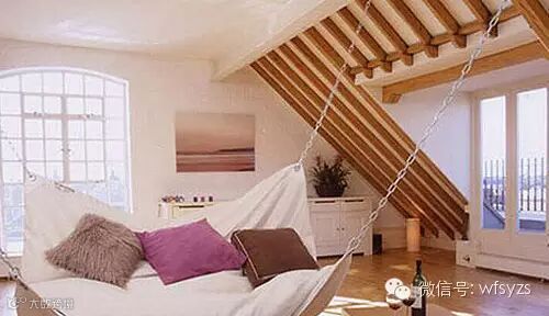 普通的床架可能会让你觉得单调,那就将阁楼上的床改变成吊床,当你依靠其上,感受那惬意悠闲的感觉。大大的窗户,迎来了极好的采光。