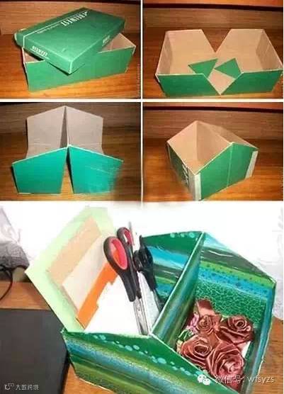 敞口收纳盒:巧妙地将旧鞋盒改制成一个敞口的收纳盒,不妨一试。