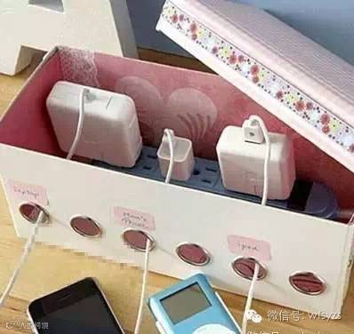 电线收纳盒:这是一个非常巧妙的方法,将插座放入鞋盒内,既使各种凌乱的线也能保证总体视觉上的美观和清洁。