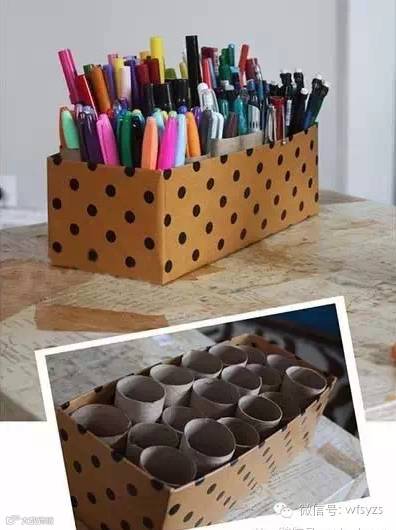 收纳笔筒:有孩子的家庭一定知道,孩子们用的笔可谓种类繁多,这个用鞋盒及各种卫生纸芯组合成的收纳装置可以清楚地将彩色水笔、蜡笔、铅笔等零碎进行分类,一目了然,简单实用哦。