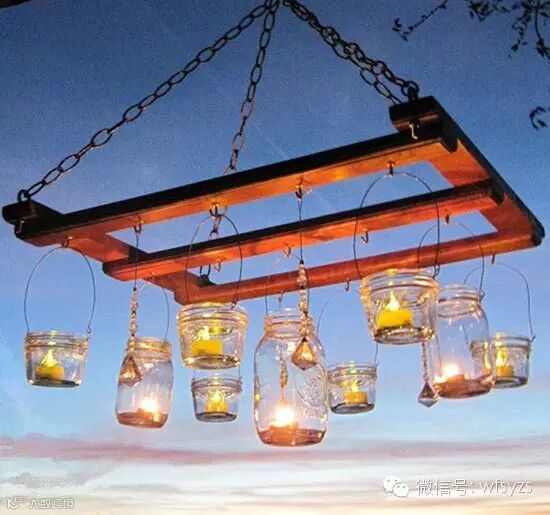 用木框吊起装着烛台的瓶瓶罐罐,自己动手即可完成,还能体验一把DIY的乐趣。