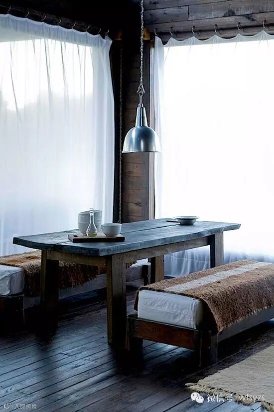 一盏金属吊灯孤零零地垂下,让这个原木打造的小餐厅显得更加冷冷清清,年轻人也可以追求避世生活。