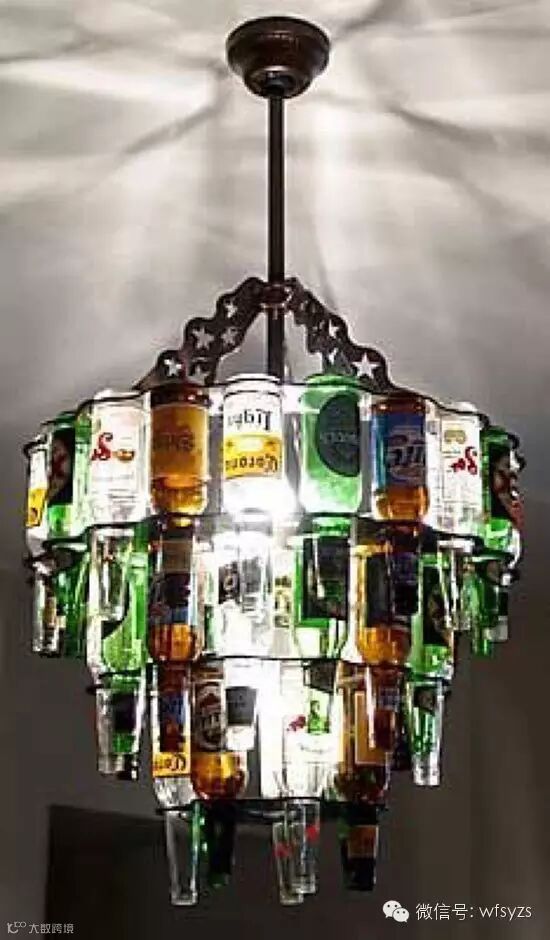 喝剩下的酒瓶子也可以DIY成一盏大吊灯,保证会成为空间中最大的焦点。