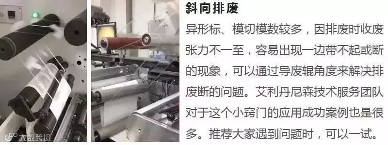 斜向排废,调节导废辊角度, 建议斜角的那边是废边较大为原则(导废辊较高的一端是废边较宽的一边)。
