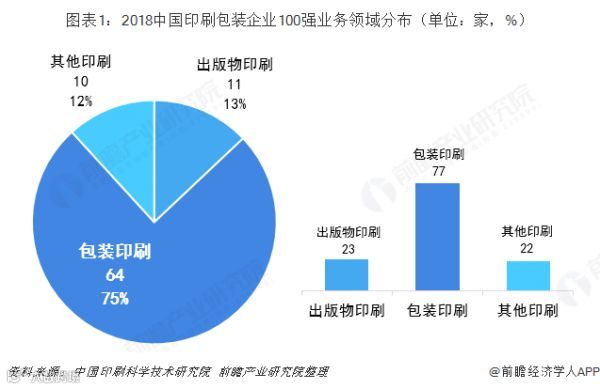 据《印刷经理人》杂志发布的“2018中国印刷包装企业100强排行榜”榜单(评选范围为2017年度销售收入超过2亿元的印刷包装企业),百强中单一从事出版物印刷的企业有11家,单一从事包装印刷的企业有64家,单一从事其他印刷的企业有10家。如果将单一业务与混合业务汇总,通盘考察百强企业的业务版图,涉及出版物印刷的企业有23家,涉及包装印刷的企业有77家,涉及其他印刷的企业有22家。