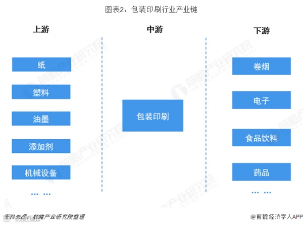 包装印刷行业的上游主要是造纸、油墨及添加剂、设备制造业,下游衔接卷烟、电子、食品饮料、药品等行业。