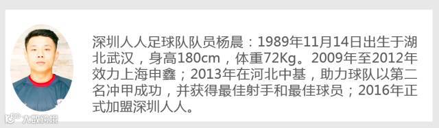 2016中国足球协会乙级联赛第三轮,深圳人人凭借10号杨晨在第15分钟的一脚远射,在这场雨战中以1:0战胜丽江飞虎,获得2016中乙联赛的首胜,这粒进球也成为俱乐部2016中乙联赛首粒进球。