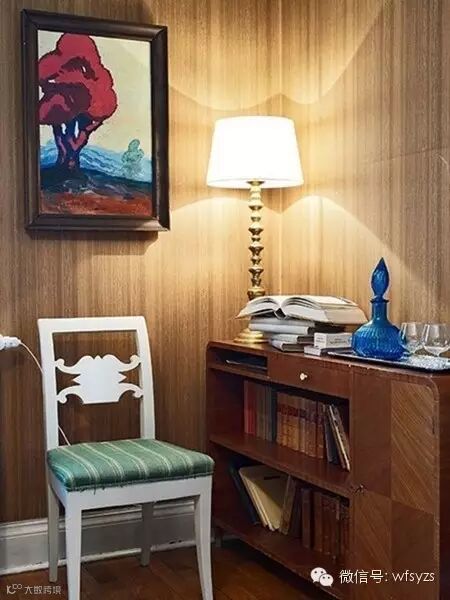 墙上贴了木纹壁纸,搭配木质书柜,让人仿佛置身小木屋内。为了不让墙面太过乏味,挂一幅装饰画也是不错的选择。