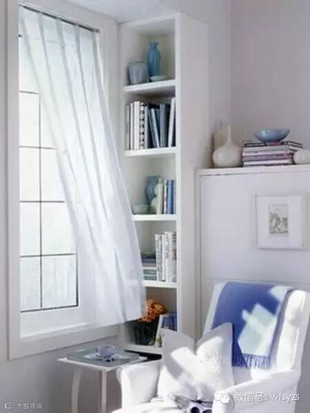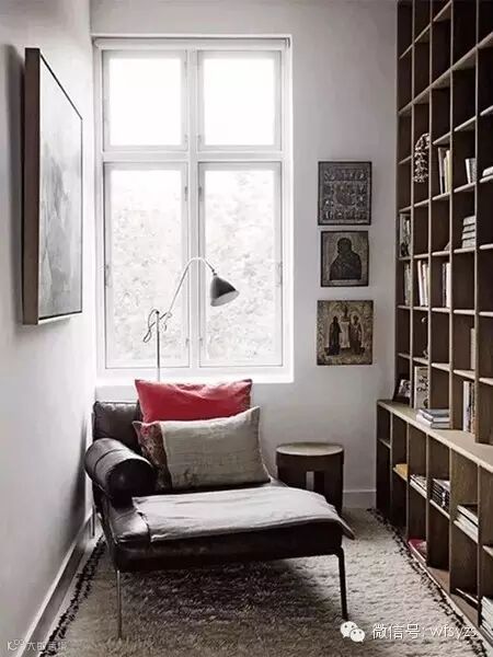 狭小的空间有时也会带来更多安全感,一面靠墙,一面靠书架,与书籍为伴的时光永远不会孤单。