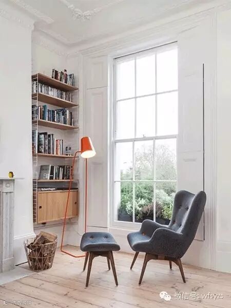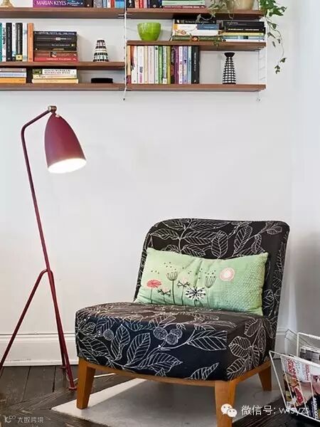 其实只要在家中空闲的角落放一把椅子,就可以安静地读书了。墙上的置物架刚好可以用来收纳各种书籍,椅边再放一只杂志篮,想读什么都可以随手取阅。