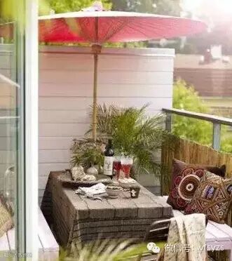 面积过小露天阳台,可以尝试打造成绚烂户外小餐厅。一张桌,两把椅,轻松让角落盖上田园气息。加上一把遮阳伞,享受新鲜空气的同时更营造一种轻松的惬意。
