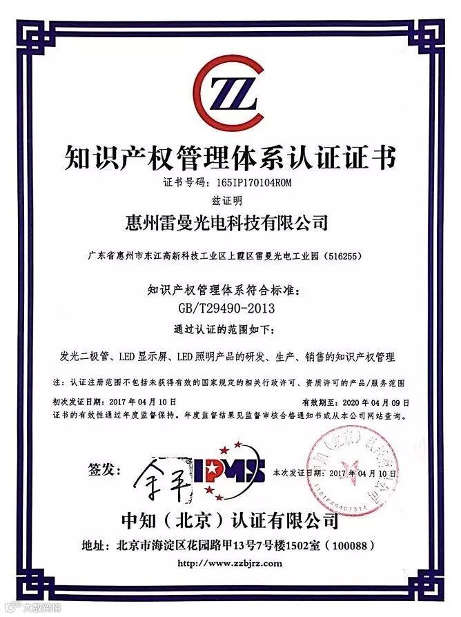 2017年4月10日,根据中国国家认证认可监督管理委员会(CNCA)的有关规定及国标《GB/T9490-2013企业知识产权管理规范》的标准要求,雷曼股份圈子子公司——惠州雷曼光电科技有限公司以其完整规范的知识产权管理流程及卓有成效的深入实施,顺利取得中知(北京)认证有限公司颁发的《知识产权管理体系认证证书》。