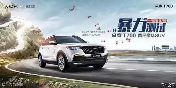 众泰T700"一气呵骋驭万里暴力测试"以众泰T700的出生地——浙江金华为起点, 将采用歇人不歇车的方式途经南昌、长沙、重庆、西安、兰州、西宁、嘉峪关、乌鲁木齐等地区,贯穿七省一市,涵盖山路、高原、沙漠等复杂地貌和极端环境,往返里程超过12000公里。十家媒体将亲身试驾全程,对车辆的动力、操控、悬挂等各个方面的实际情况向广大消费者进行全方位的报道,真正解密众泰T700的产品品质。