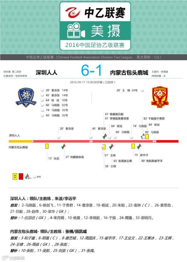 2016年9月17日,2016中乙职业联赛第11-12名排名赛第二回合,深圳人人主场6-1大胜内蒙古包头鹿城。马晓磊完成帽子戏法,曹添堡梅开二度,杨斌一骑绝尘。最终,深圳人人队以总比分7-1的内蒙古包头鹿城队,获得《2016年中国足球协会乙级联赛》全国第11名。