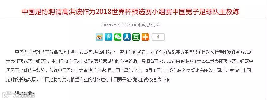 中国男子足球队主教练选聘报名于2016年1月29日截止。鉴于时间紧迫,为了全力备战完成中国男子足球队近期比赛任务(2018世界杯预选赛小组赛),中国足协在征求选聘专家组意见和推荐建议后,经慎重研究,决定由高洪波作为2018世界杯预选赛小组赛中国男子足球队主教练,带领中国男足全力备战并完成3月24日与马尔代夫、3月29日与卡塔尔队的两场比赛任务。同时,考虑到中国足球的长远发展,中国足协将更为慎重专业的继续进行中国男子足球队主教练选聘工作。