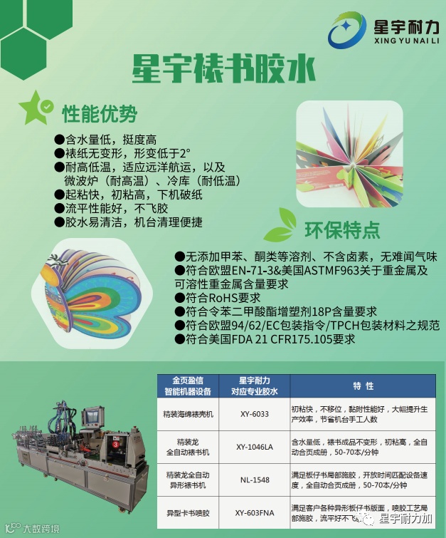 结合星宇耐力所研发的专用裱书胶,"高效强粘,稳定性强、裱后纸板含水率低",智能机器化设备,更好的提高童书的生产效率。产品也是经过严格检测,符合儿童接触等法规标准,为批量生产个性化儿童书提供了完美的解决方案。