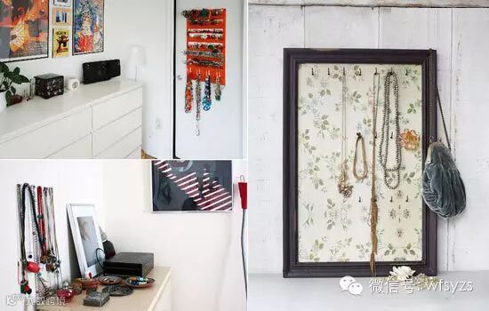 4、首饰收纳——墙面挂饰收纳一目了然。首饰的收纳也很讲究,墙上钉上几个钉子用于分类收纳项链,桌上摆上几个首饰盒分类收纳戒指、手镯、耳环等小饰物。