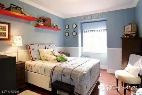 这间儿童房装修得非常清新可爱。蓝白相间的墙面让人仿佛置身于蓝天白云之下,惬意十足。墙面上的两个夹板上放了一些个性十足的装饰品,比如木吉他、小猴子玩偶等。这里我们可以发现儿童房装修技巧的其中一点就是就将色彩搭配,红色的夹板与蓝色的墙面相配,让整个房间在清新中多了活泼的意味。这个儿童房装修有一个非常独特的地方,那就是飘窗上的那个英文——“GABRIEL”,“GABRIEL”是《圣经》中七大天使之一,是报喜天使。在房间特地弄上这个名字,可以充分感受到父母对孩子的爱。这也是第二个儿童房装修技巧:表现爱意。