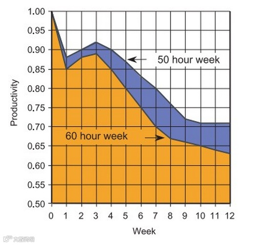 事实上,无论从长期还是短期来看,工作时间越长,工作效率和效益就越低。如果连续两个月,每周都工作超过60个小时,你的生产力下降甚至会导致整个工期效率的下降。而同样的工作,一周40个小时就够了。