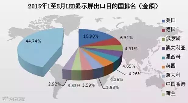 根据2015最新的海关统计数据显示,2015年1月~5月,中国出口LED显示屏金额达到2.6亿美金,出口数量达44万台。其中,五月份出口金额约为5900万美金,占比约为前5个月总和的22.22%。