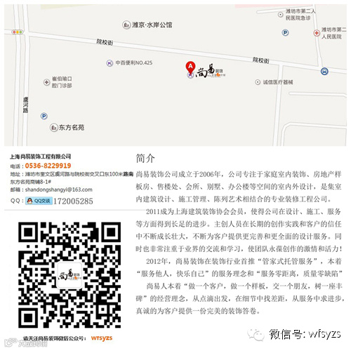 潍坊尚易装饰地址:奎文区院校街与虞河路交叉路口向东100米路南东方名苑商铺8#-1.