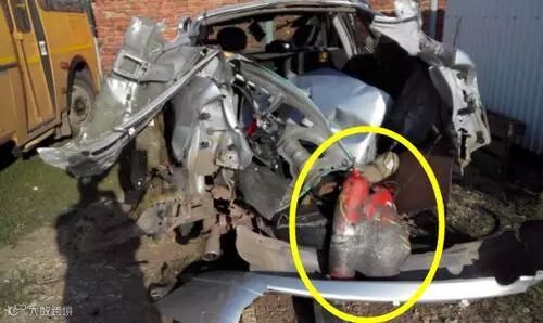 从汽车的情况来看,车尾部分受损是最严重的,车头部分却没有什么变化,看来问题出现在车尾部分。经过一番观察之后,男子在车尾的废铁中找到了一罐红色爆开的东西,这个东西并不陌生,就是男子放在后备箱中的二氧化碳灭火器。看来是灭火器发生了爆炸,然后把整个后备箱炸毁了。