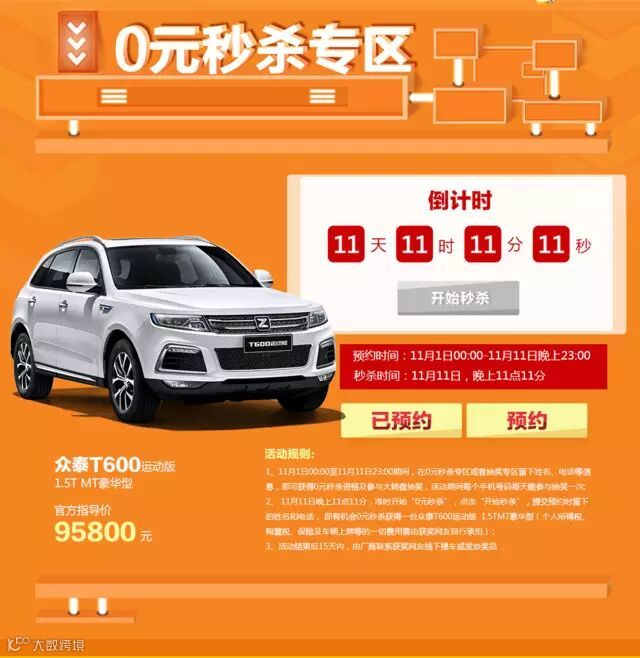 11月1日晚间11:11准时开始狂欢专场,点击“开始秒杀”并提交预留时留下的姓名和电话,即有机会0元获得价值95800元众泰T600运动版1.5T MT 豪华型SUV一台。