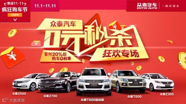 众泰汽车11月1日-11月11日晚间11:11期间,在预约秒杀专区留下姓名、电话等信息即可获取秒杀资格并参与大转盘抽奖。