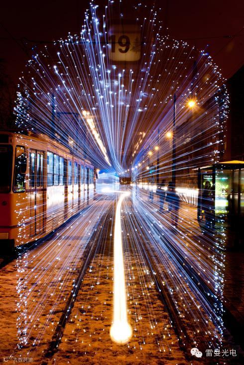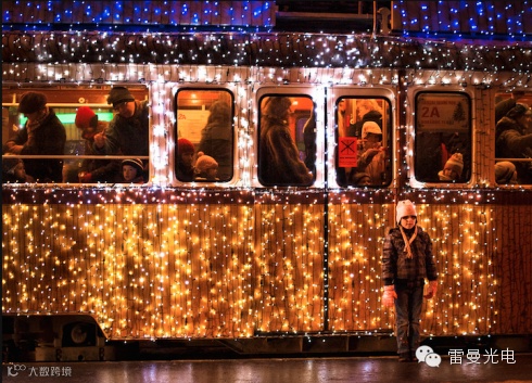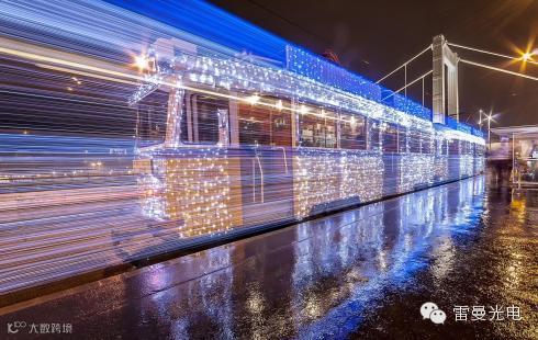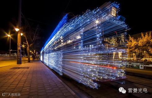 全身覆盖了30000盏蓝白两色LED灯的钢铁大物,在大雪皑皑的城市轨道上穿梭,通过长时间曝光,恍如时光穿梭机,感叹圣诞老人是不是改了座驾……