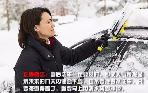 正确做法:雪后洗车一定要及时,即使天气预报显示未来的几天内还会下雪,也不要拖着不洗车。此外,露天洗车辆时,清水很容易灌进锁眼,这时因雪后天气寒冷,特别容易把 锁芯冻住。因此洗车前,最好能用胶布把锁眼贴住,以防止进水。用洗车机洗车,水雾均匀,门被冻住的机会比较少。如果冻住了,用打火机把钥匙烧一下,就可以 很容易地把冻住的车锁打开。