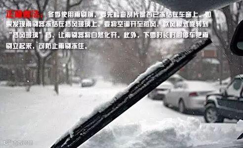 之所以不要盲目启动雨刷器,是因为雨雪天晚上汽车雨刷很容易就被冻结在车窗上。所以,车主雨雪天早上开车时要先检查雨刷是否有被冻住。如果出门发现雨刷器被雪水或由于结霜粘在挡风玻璃上的话,千万不要用热水直接冲洗,这样容易使车窗因为温度变化而炸裂、雨刷器变形。