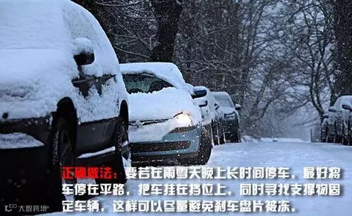 正确做法:雨雪天气后,刹车盘片上会有雪水,晚间停车如果拉手刹第二天早上可能盘片被冻上。车主若在雨雪天晚上长时间停车,最好将车停在平路,把车挂在挡位上,同时寻找支撑物固定车辆,这样可以尽量避免刹车盘片被冻。