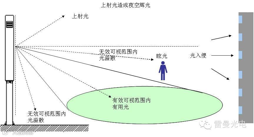 三是对产生夜空辉光的上射光的防治。户外灯具的光源向不同方向射出光线,在需要照射的有效范围内的光是有用的,但是在不需要照射的范围内也会有溢出光,形成光污染。特别是上射光会产生夜空辉光,形成严重的夜空光污染。国际上不同的国家、专业协会等,对上射光都有严格的控制,国际照明委员会(CIE)、英国对上射光占灯具总光通量的比例均做了限定。