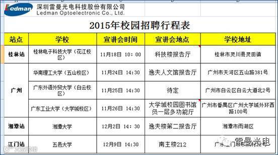 为逐步优化公司人才结构,保障内部人力资源的进一步培养和选拔,逐步完善人才梯队建设,引进一批综合素质高,可塑性强的基层人员,注入新鲜血液。同时为进一步提高雷曼光电在高校师生中的知名度,提升公司品牌及名誉度,增强企业吸引力,为持续性引进优秀人才打下基础。自11月中旬开始,人力资源中心开始陆续启动2015年校园招聘。本次校园招聘分别在华南理工大学、广州外语外贸大学、广州工业大学、桂林电子科技大学、湘潭大学、五邑大学六所高校举办大型专场巡回招聘会,招聘岗位分为管培类、研发技术类、营销类、生产储干类、职能类,约招聘实习生为65人(不含管培类),通过实习进行优中选优,最终为公司选拔优秀人才。