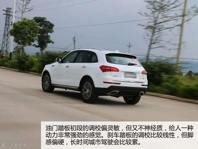 油门踏板初段的调校偏灵敏,但又不神经质,给人一种动力非常强劲的感觉。T600运动版在噪音的控制方面表现不错,低速状态下静谧性非常优秀,高速状态下胎噪会逐渐明显,不过还能接受,发动机噪音的抑制也算不错。