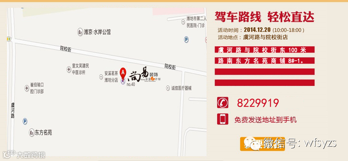 潍坊尚易装饰地址:奎文区院校街与虞河路交叉路口向东100米路南东方名苑商铺8#-1.