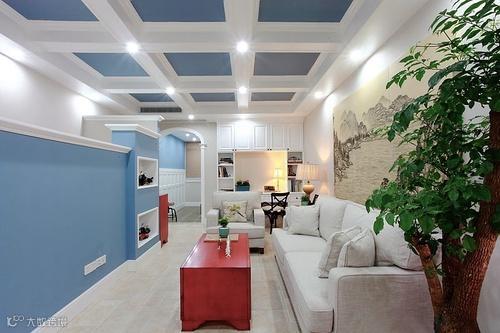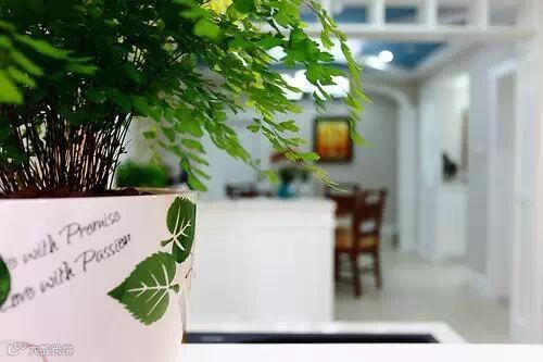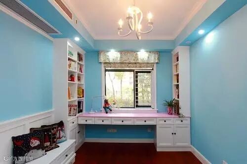 客厅全景来了,回眸写字台,实现了在客厅看书上网的愿望,白色蓝色的结合非常舒服。