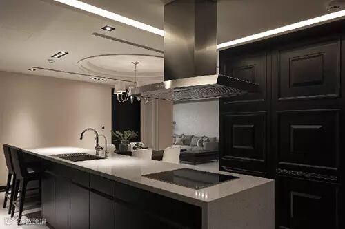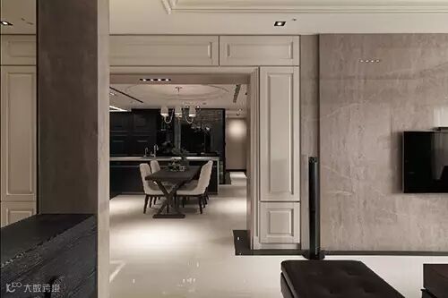 编辑点评:向内递延的视野端景处,呼应客厅门斗上的简约线条,地所设计于于开放餐厨区改以深灰色系对比呈现。