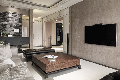 编辑点评:为让电视墙更见简约,设计师将机柜隐藏规划于场域间的门斗线条内,跳出地所设计与众不同的质感古典。