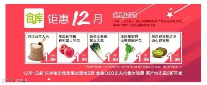 12月1日起,东单菜市场悠惠生活携手食库公司举办为期2周的O2O农贸市集活动,届时悠惠生活馆2层每天将提供多款原产地农产品免费试吃,五折售卖,还可以通过悠惠生活线上下单,3公里内,2小时保证送达,开开心心试吃,轻轻松松购物,机会难得,不容错过!