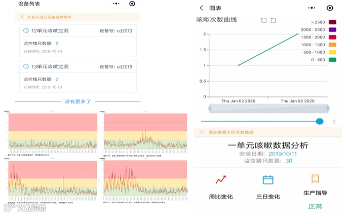 猪群异常声音监测系统利用麦克风阵列技术实现猪舍单元的声场覆盖,采集猪舍声音数据,配合猪只声音识别技术,实现猪只咳嗽声的次数统计和分区域统计。通过24小时持续的咳嗽检测和数据分析,在猪只呼吸道疾病发病初期预警,早期干预,并且针对用药效果持续监测。辅助呼吸道类疾病的预警和干预,降低管理人员的劳动强度、用药成本和用药范围,通过整场的部署,对于特定病原体在生产体系内的传播提供评定依据,对后期生物安全措施升级提供参考。