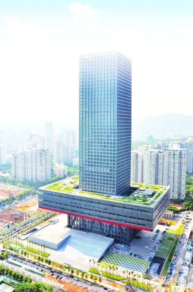深交所新大楼位于深圳福田中心区、市民中心旁,是一幢很有特色的建筑。整体造型非常独特,在立柱形的大厦中下部,建筑的底座被抬升至30多米高,形成一个巨大的“漂浮平台”,平台的“腰部”由一条鲜亮的光带“缠绕”,整体造型犹如一个漂亮的烛台。