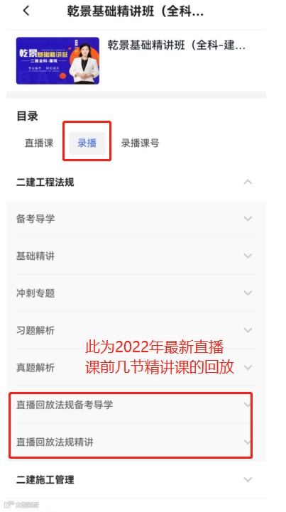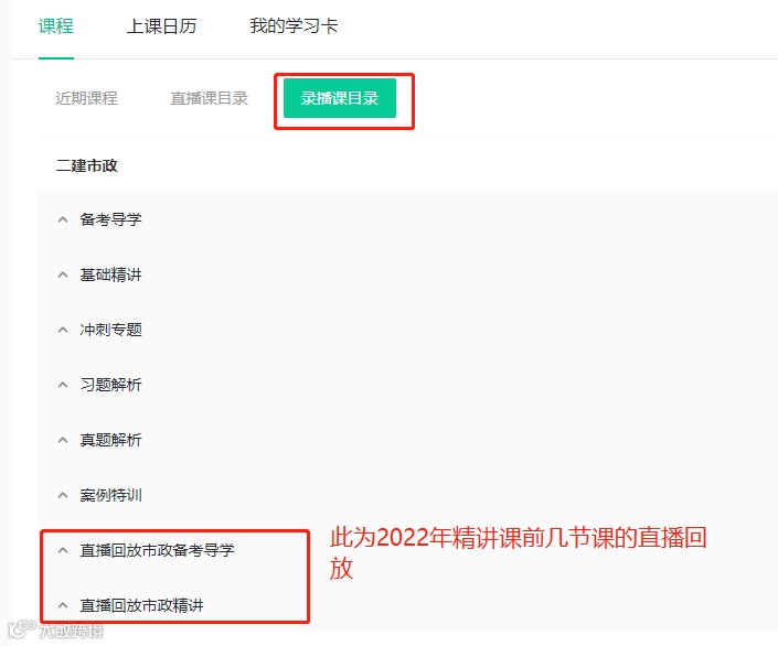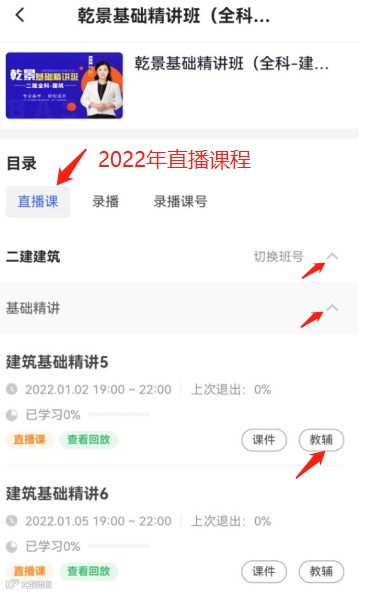 4、课程分为直播课和录播课,直播课为2022年最新课程,录播课为2021年的课程,可根据自身需求进行观看学习,点击教辅可下载讲义。