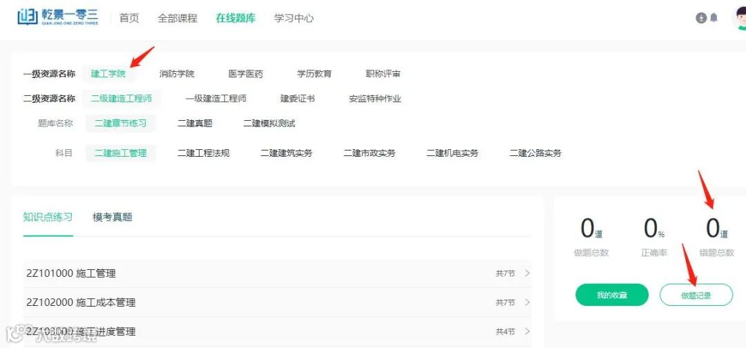 1、点击题库---选择所做题的模块,点击快速练习,错题本可查看错题,做题记录能看到所做的题。
