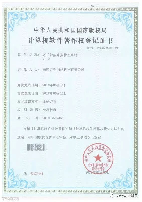 经中华人民共和国国家版权局审核,根据《计算机软件保护条例》和《计算机软件著作权登记办法》规定,7月31日我公司荣获计算机软件著作权登记证书——《万千智能账务管理系统V1.0》,登记号为:2018SR597458。