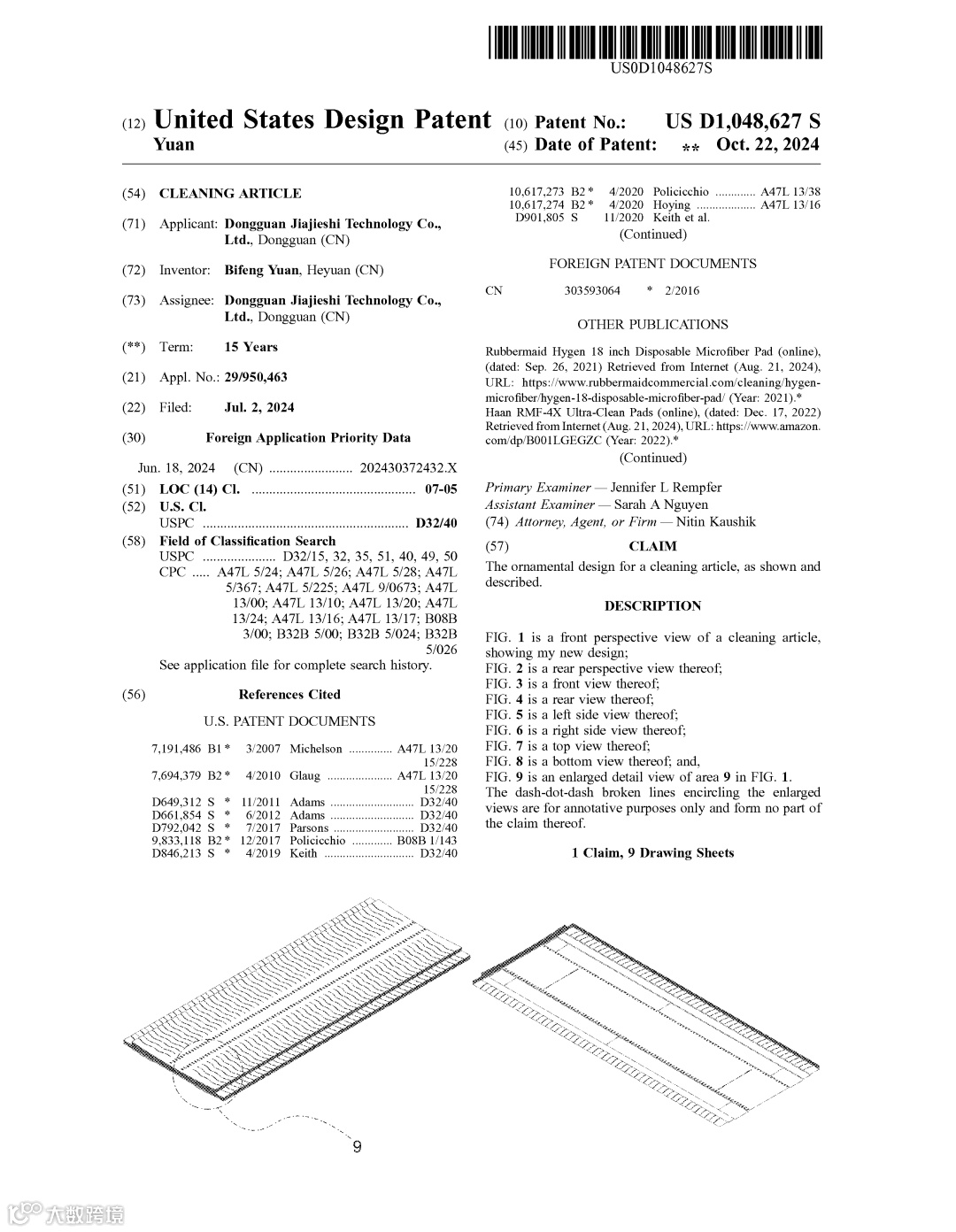 涉案产品是来自国人卖家生产制造的地板清洁垫,该产品能够轻松安装于特定拖把上,表面布满数条纹理,能够高效吸附灰尘,清洁力良好,用后即可直接丢弃省时省力。
