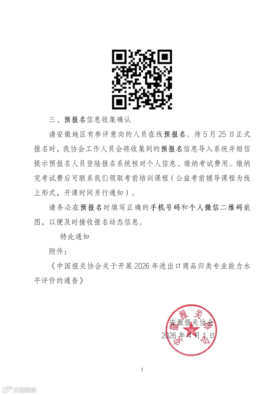 【水平测试】关于2026年“进出口商品归类专业能力水平评价”安徽地区考生预报名组织工作的通告